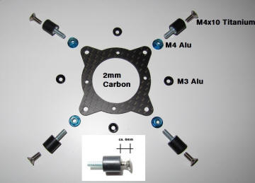 Softmount für OS-Belt-Drive Ersetzt die Aluminium Platte und schafft die Möglichkeit eine schwingungsgedämpften Aufhängung bestehend aus: CFK-Spant Schwinggummis, Alumuttern Titanschrauben Unterlegscheiben für Senkkopfschrauben |