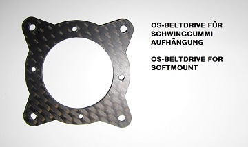 Softmount für OS-Belt-Drive Replaces the Aluminium plate and provides the possibilitiy for a softmount Material: 2mm Carbon |