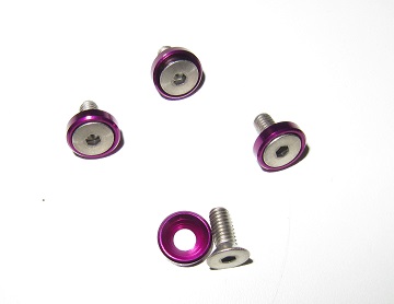 M4 Titanschraubensatz für F01025 und F01026 Titanschrauben um den Motor mit dem Carbon Spant zu verschrauben. Mit violetten Alu-Unterlegscheiben. Satz aus 4 Schrauben und 4 Scheiben